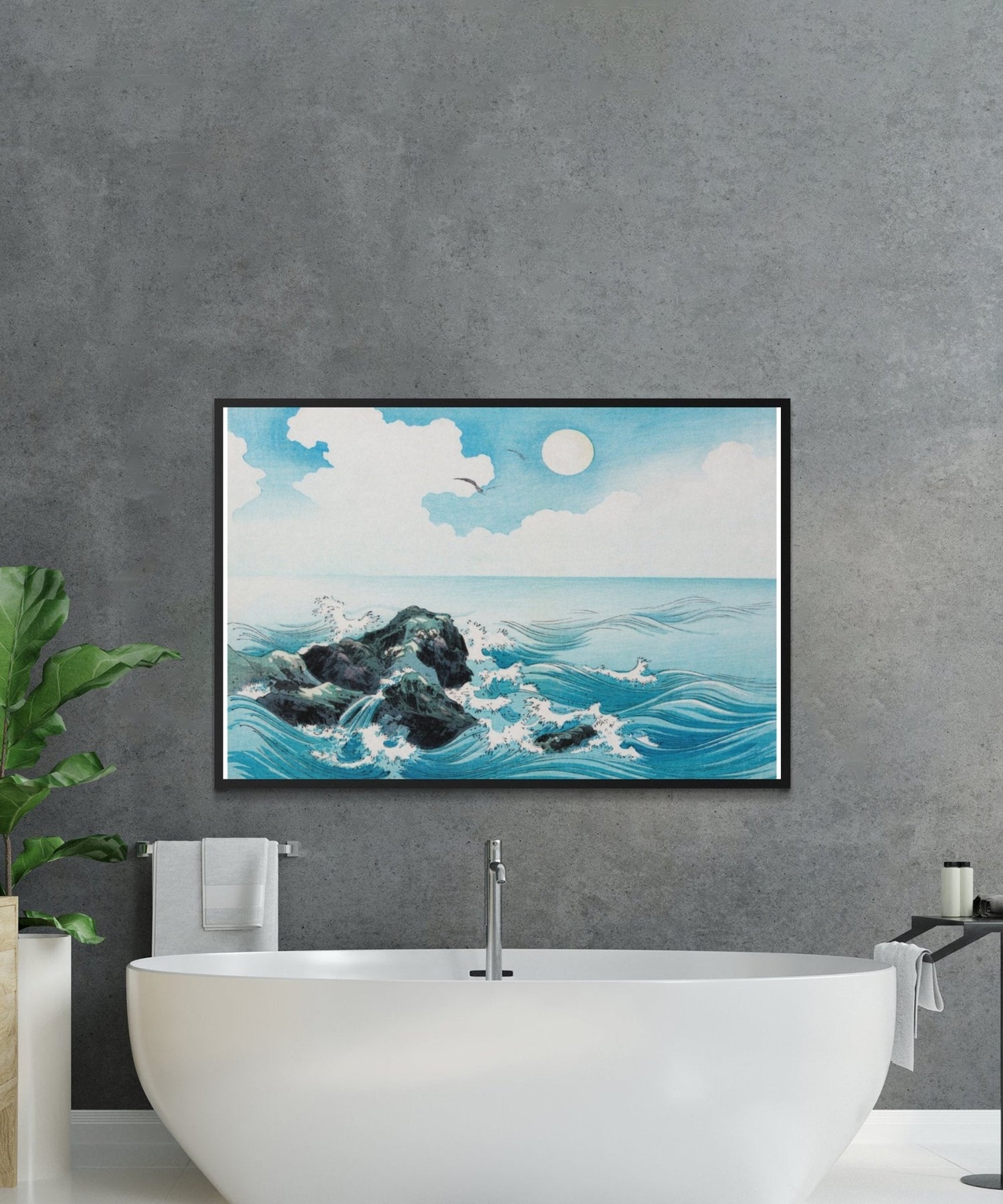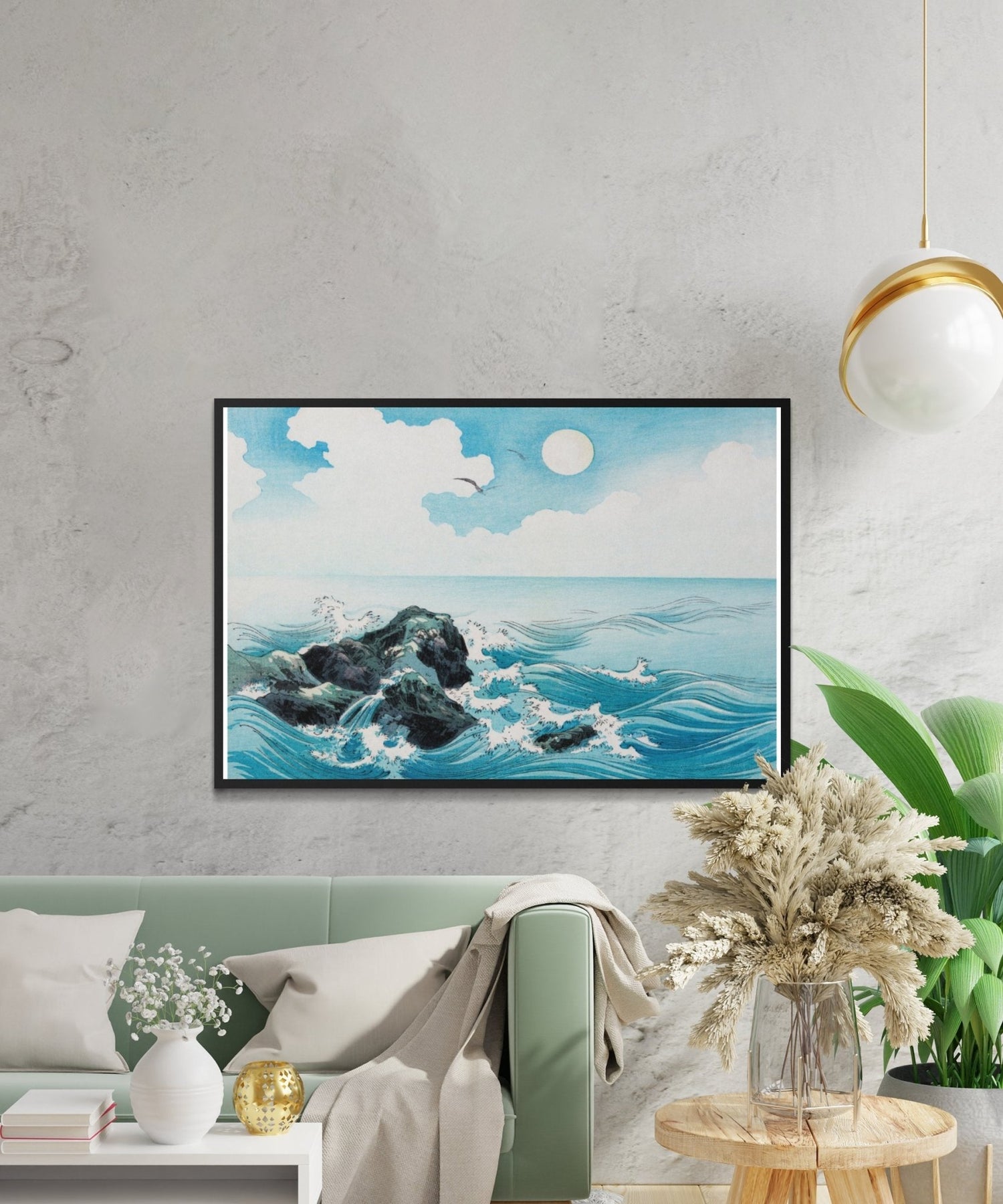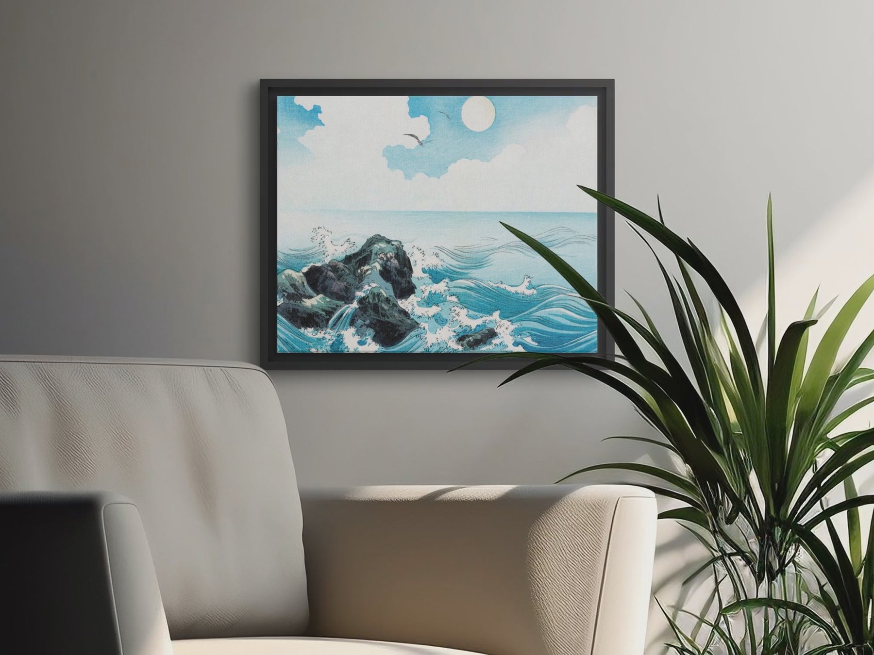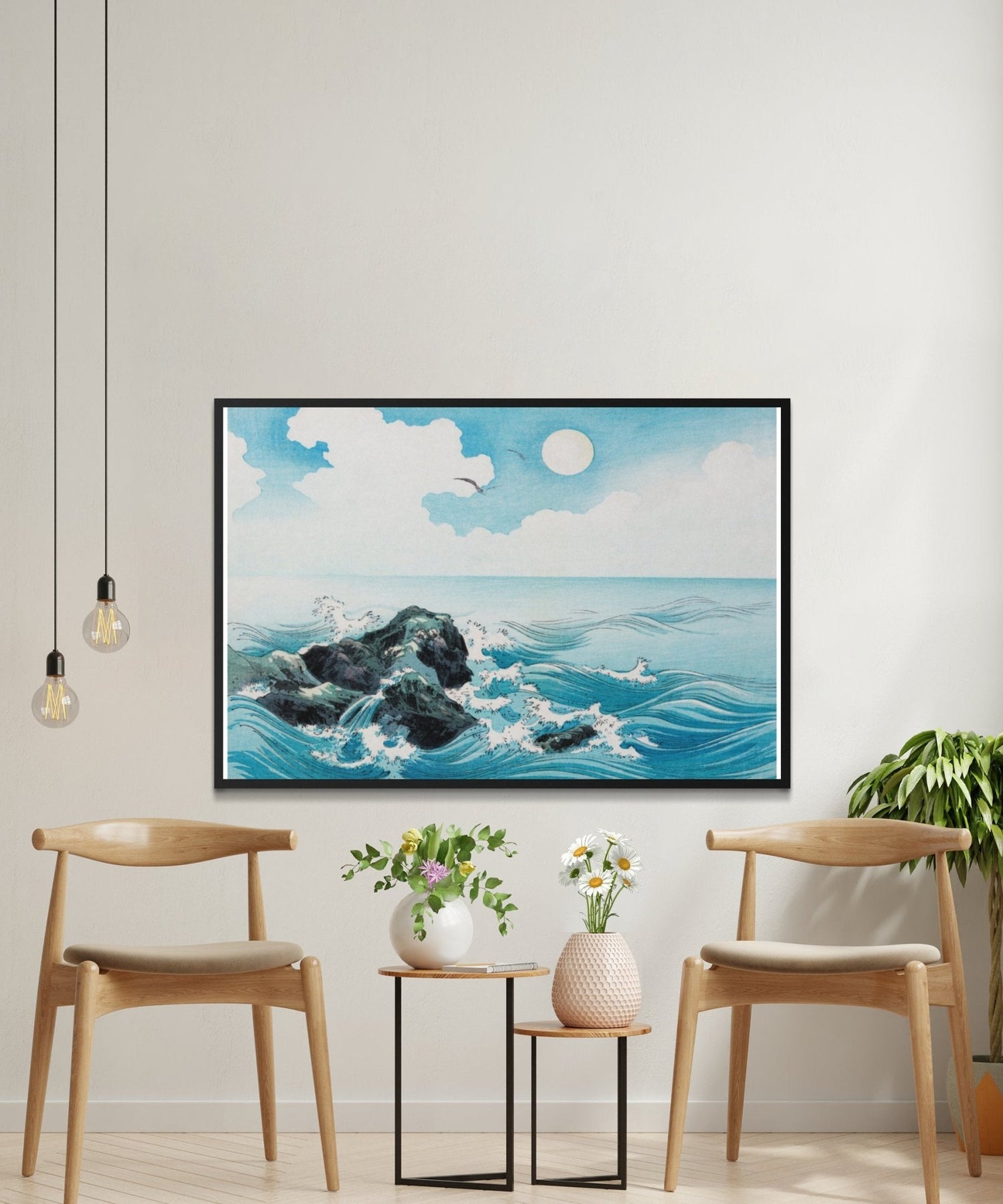 Instantly elevate your space with this stunning Ukiyo-e digital art print. This captivating image features dynamic ocean waves crashing against rocks, a serene sky with clouds, birds, and the sun, creating a tranquil yet powerful atmosphere. Perfect for adding a touch of Japanese artistic flair to your home or office.